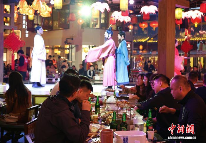 4月7日,山东淄专,焚烤店推出演艺剧院,以陶醉式情形剧、歌舞互动等方式挨制网白挨卡天,吸收市平易近乘客晚上花费。中新社记者 赵晓 摄