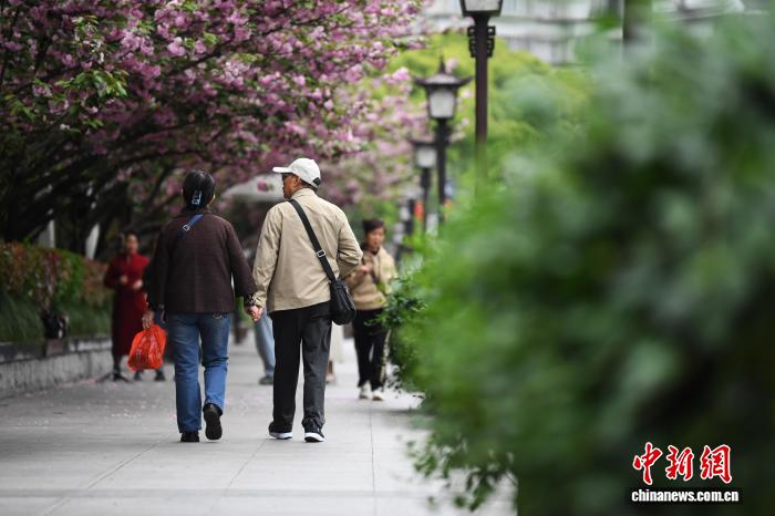 图为贵阳市北亮河沿岸,1对于暮年伉俪正联袂偕行正在怒放的樱花停。赵紧 摄