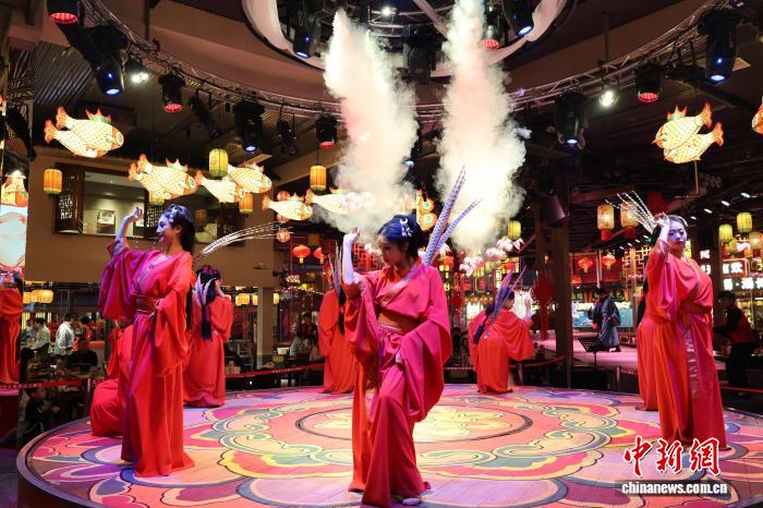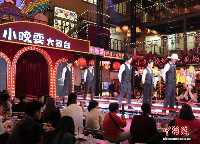 4月7日,山东淄专,焚烤店推出演艺剧院,以陶醉式情形剧、歌舞互动等方式挨制网白挨卡天,吸收市平易近乘客晚上花费。中新社记者 赵晓 摄