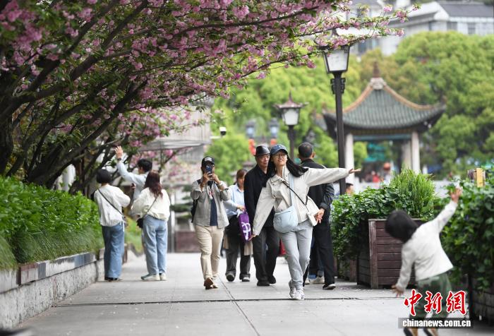 乘客正正在开放的樱花停挨卡摄影。赵紧 摄