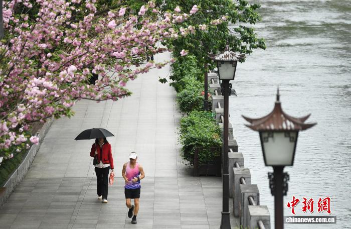 图为贵阳市北亮河沿岸,市平易近正正在怒放的樱花停跑步健身。赵紧 摄
