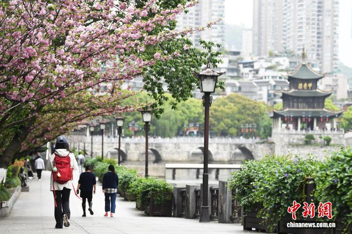 图为贵阳市北亮河沿岸,1对于暮年伉俪正联袂偕行正在怒放的樱花停。赵紧 摄
