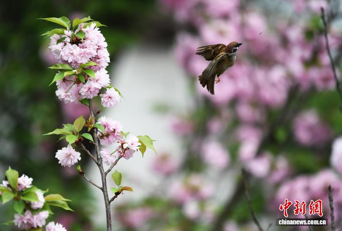 秋温花启季节,位于贵阳市北亮河沿岸的樱花竞相开放,1只麻雀正正在樱花丛中寻食。赵紧 摄